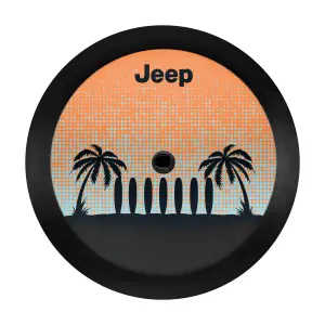 - Description: Spare Tire Cover for 32" tires. Cover is Black Vinyl and features Palm Tree design. It fits P255/75R17, LT255/75R17, P255/70R18 tires and is compatible with rear view camera. Fits Jeep Wrangler (JL).
